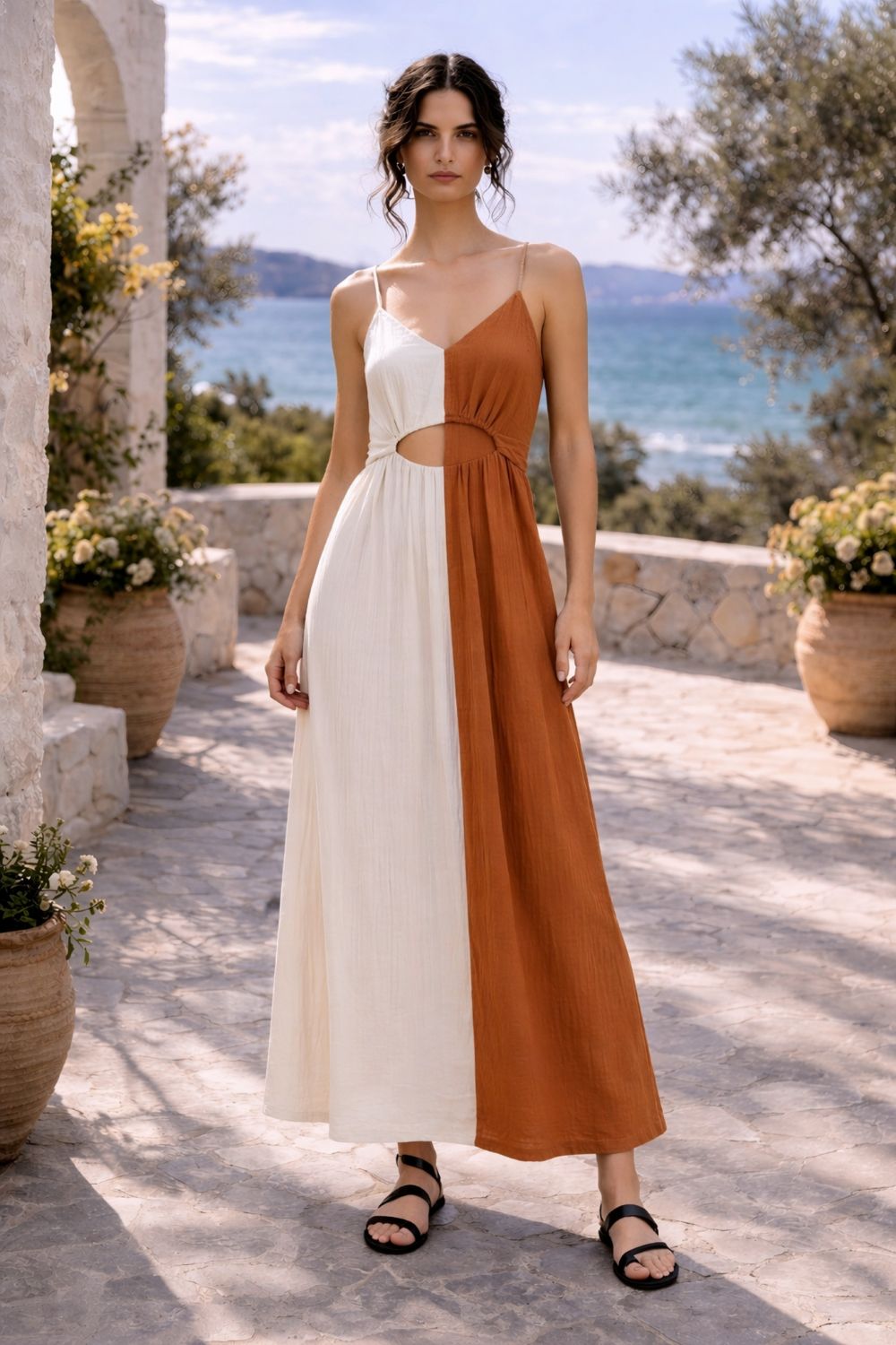 naturally, while the cut-out at the waist adds a modern, subtly sensual touch.