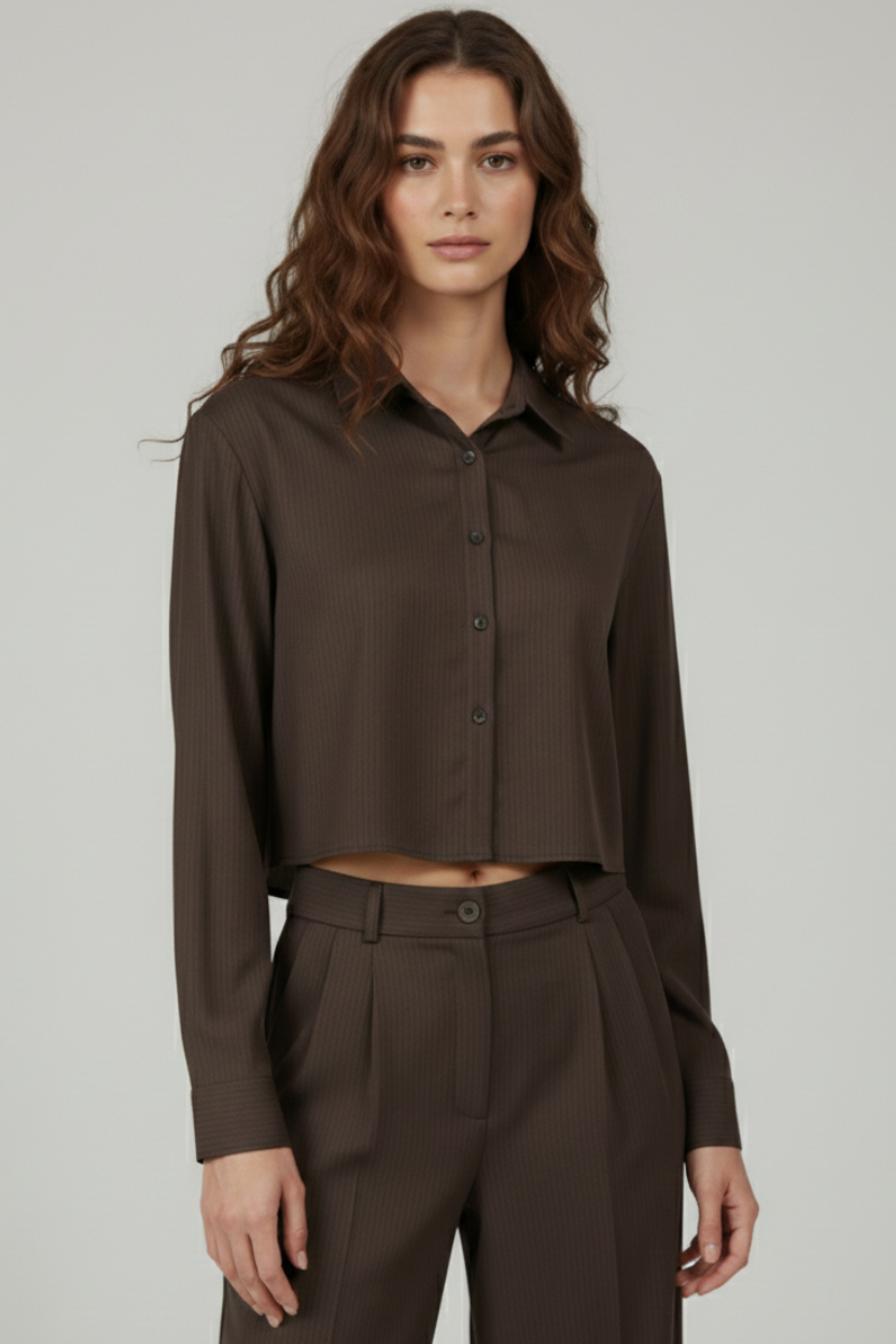 Discover the Pinstripe Cropped Shirt in deep Chocolate Brown, a piece that redefines Business Chic. With a modern, short (cropped) length that emphasizes the waist and a refined, discreet vertical stripe (pinstripe), this shirt is the perfect addition to any modern wardrobe. Ideal for creating a trendy co-ord set or for upgrading your high-waisted jeans.