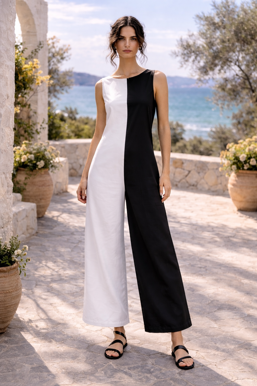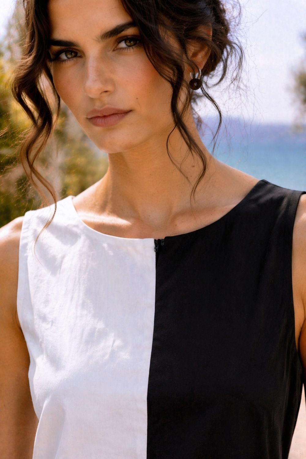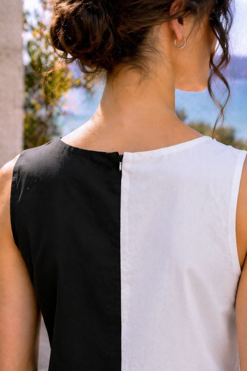 – Design: Sleeveless with striking Half & Half color-blocking in