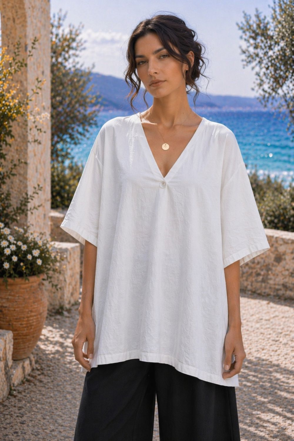 V-neckline and wide sleeves that create a relaxed yet elegant shape.