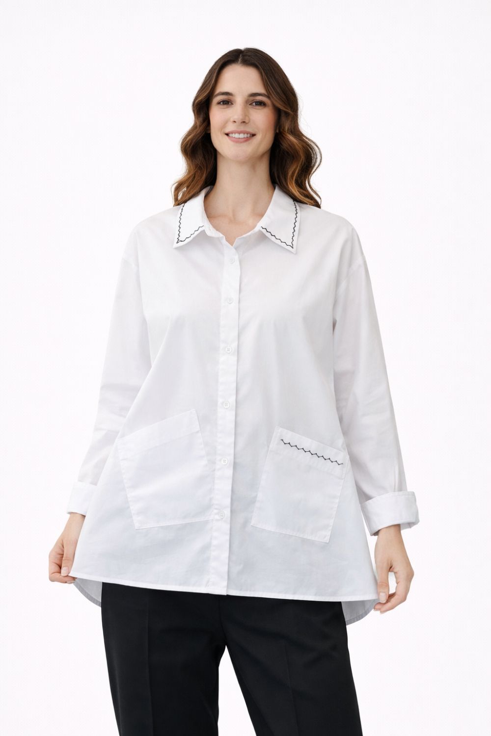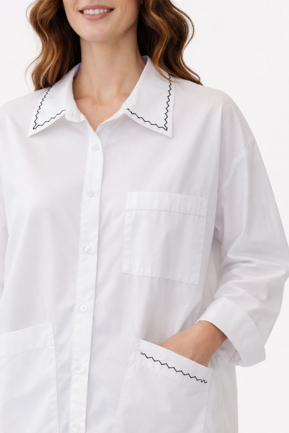 relaxed A-line silhouette with distinctive zigzag embroidery detailing on the