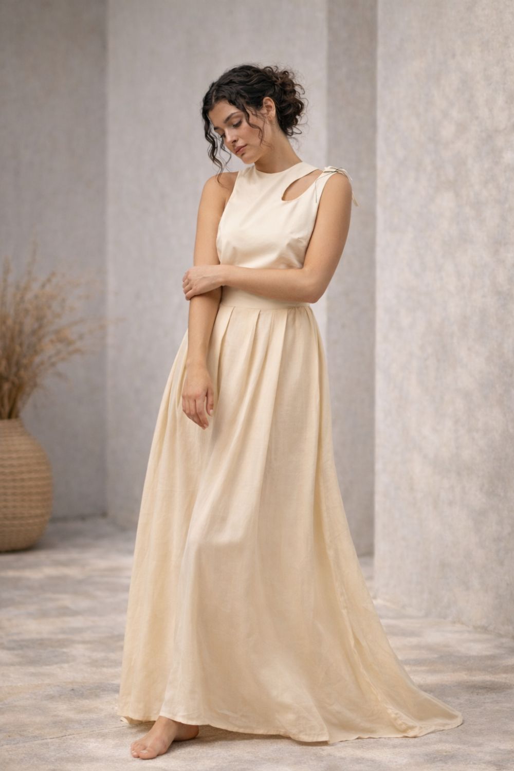 Crafted from a soft and breathable blend of 50% cotton and 50% linen/rayon, it offers a lightweight feel and natural movement. The timeless cream color adds an earthy sophistication, while the asymmetric cut-out at the front and the open back bring a subtle boldness to the look.