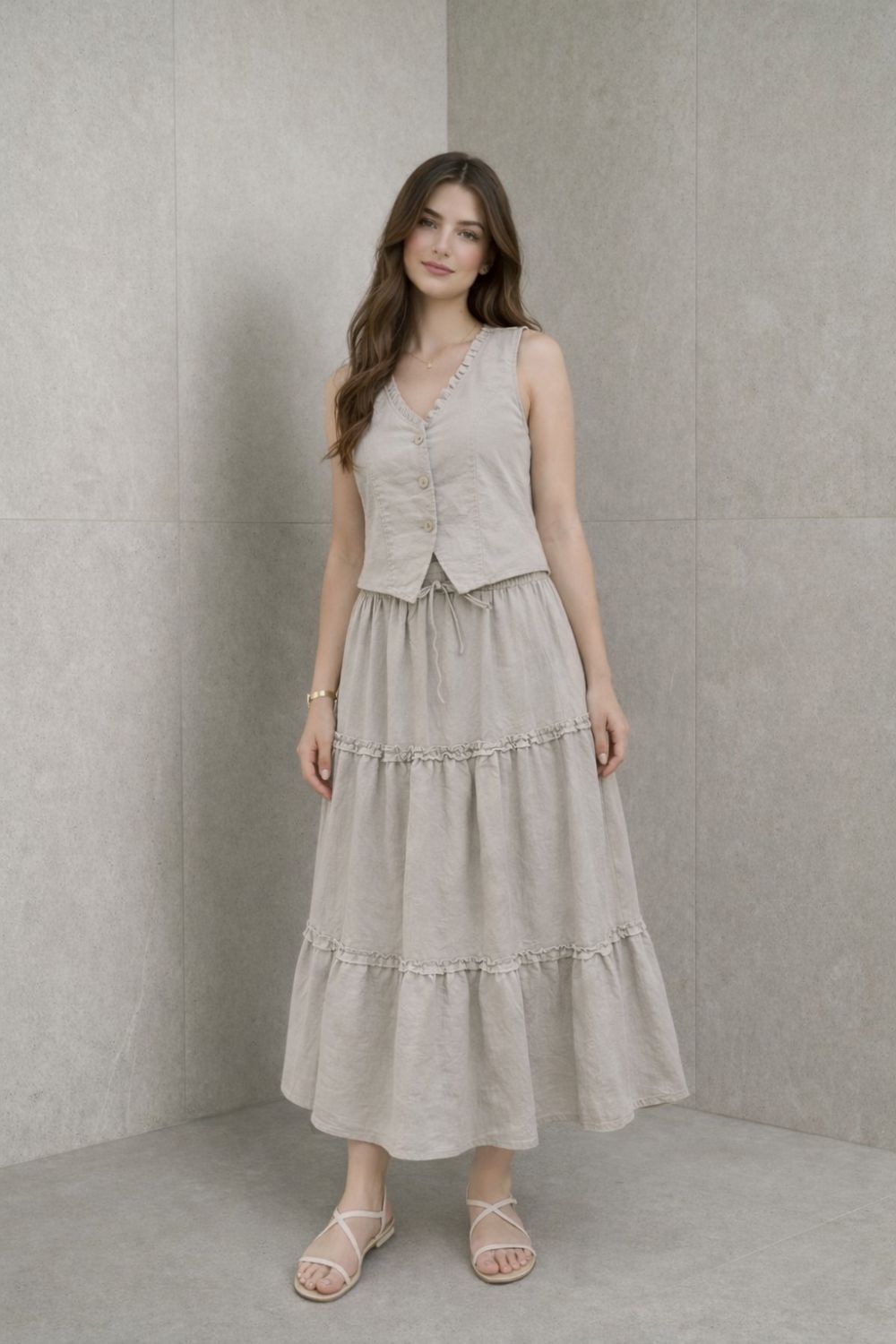 Styling Tip: Pair it with beige leather sandals (as seen in the image) and delicate gold jewelry for a dreamy holiday look or a breezy afternoon stroll. The pieces can also be worn separately: the waistcoat with your favorite denim shorts or the skirt with a simple white tank top.
