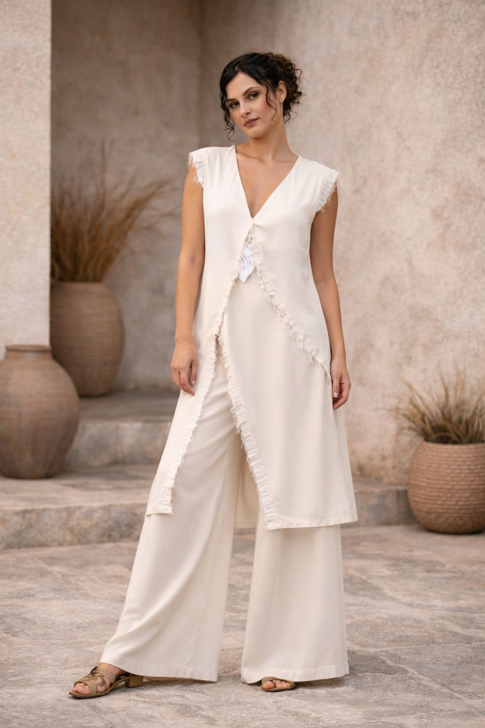 Made of 100% cotton, this two-piece set offers natural softness and graceful movement. The off white tone highlights its simplicity, while the frayed edges and deep V neckline add a contemporary artisanal character.