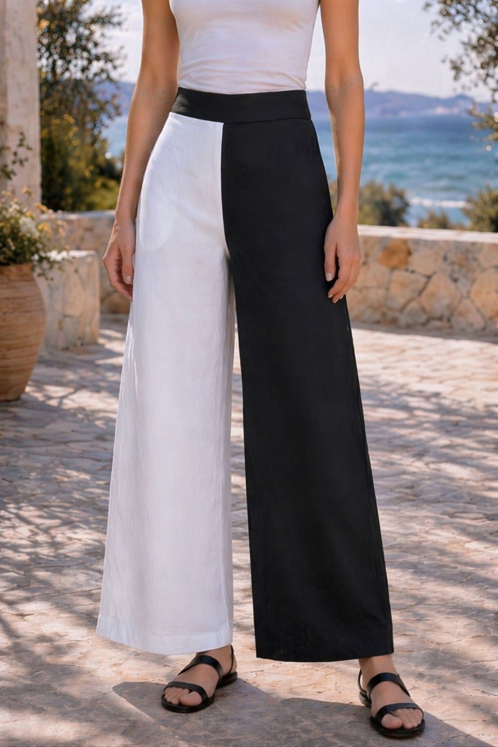 leg white, one black), these trousers create a dynamic visual contrast that