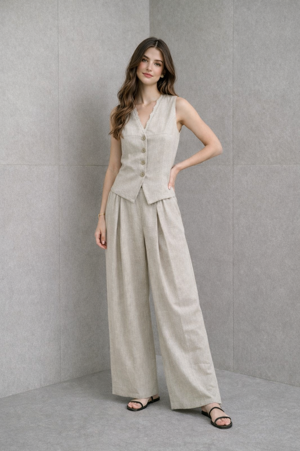 (palazzo style) with pleats, offering comfort and movement while creating a