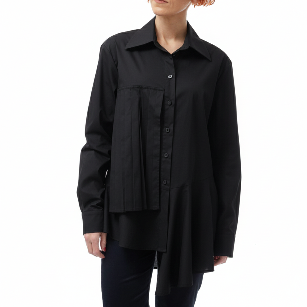 The Unequal Shirt Π-135 is the perfect choice for those who love unique statement pieces that stand out. With its asymmetrical design and minimal aesthetic, it combines the classic white shirt with a modern, bold twist.