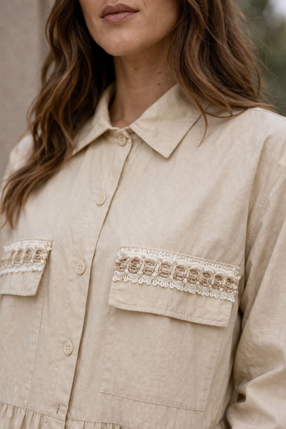BEIGE COTTON SHIRT BLACK EMBROIDERED DETAILS