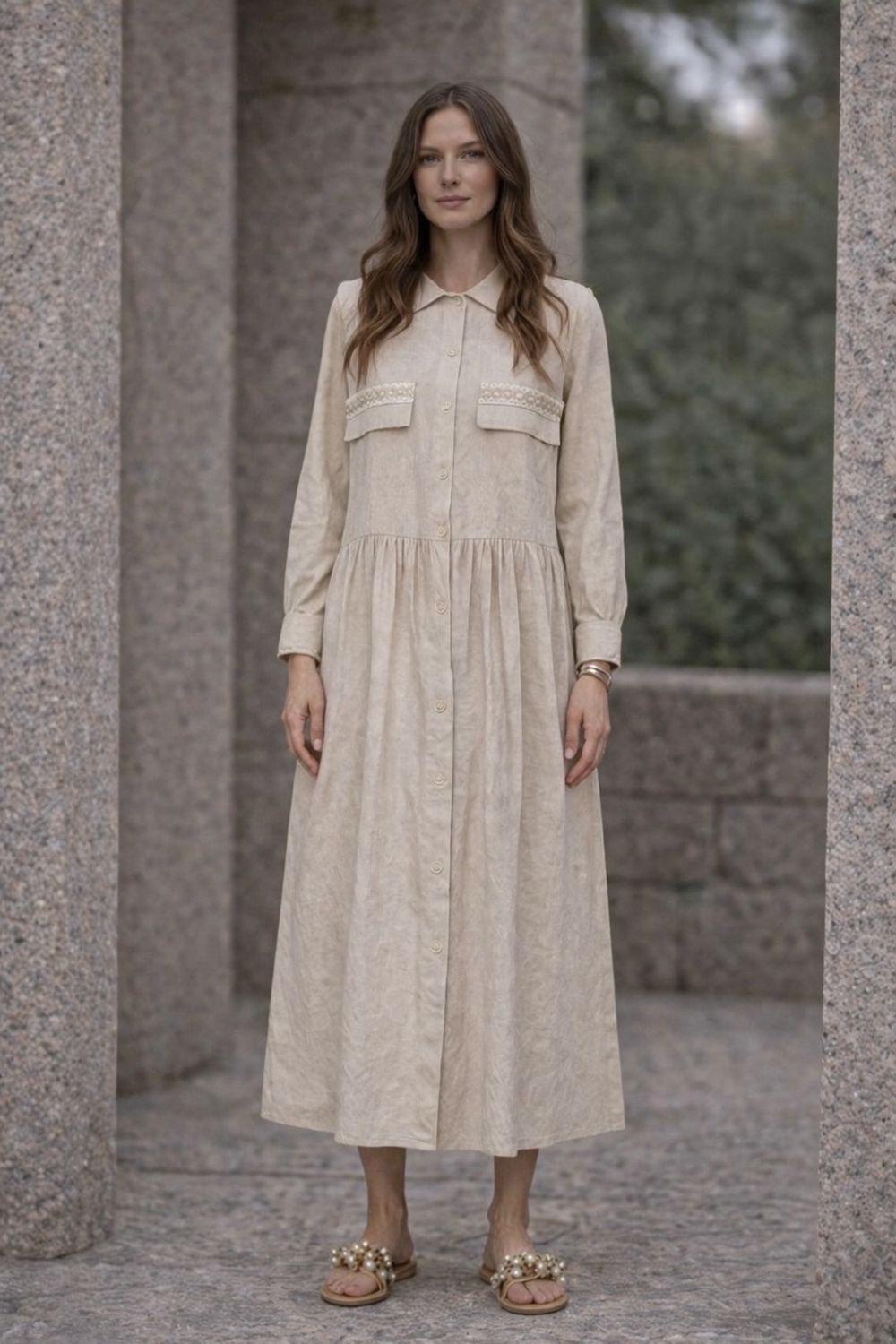 maxi shirt dress features a classic collar, full-length button closure, and long