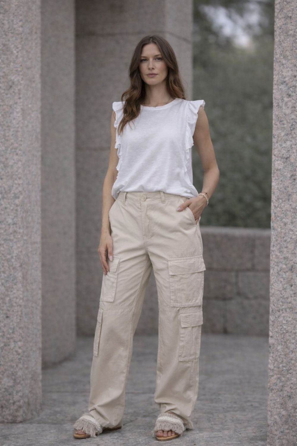 WOMEN’S WIDE LEG CARGO TROUSERS – BEIGE