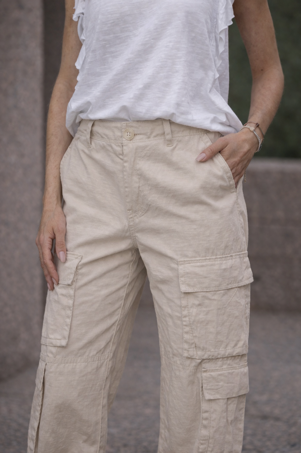high waist, side cargo pockets, and a relaxed wide leg silhouette in a versatile